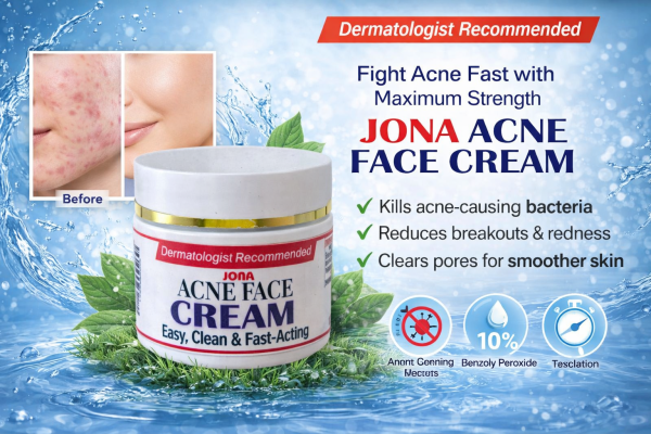 Jona Acne Face Cream delivers fast, effective acne treatment using 10% micronized benzoyl peroxide, the same maximum-strength formula recommended by dermatologists worldwide. It penetrates deep into the pores, kills acne-causing bacteria, reduces inflammation, and helps prevent new breakouts.